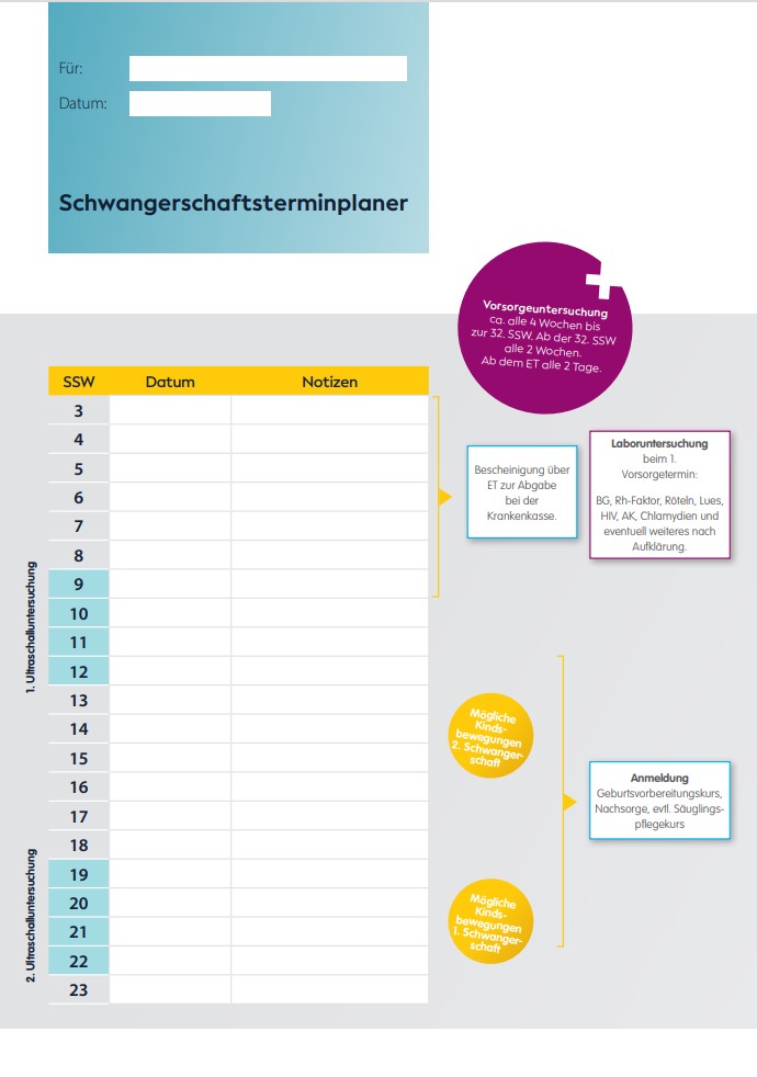 • Übersicht über alle wichtigen Termine der Schwangerschaft für die Versicherte
